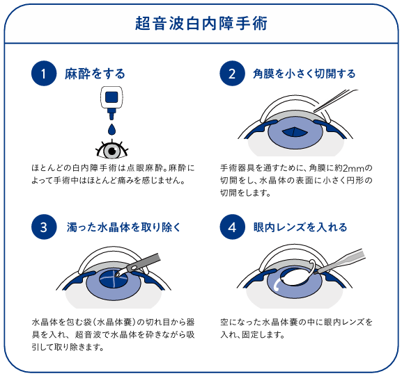 白内障手術は60歳以上の方によく行われている手術で濁った水晶体を取り除き、代わりに人工のレンズ(眼内レンズ)を眼の中に挿入します。
